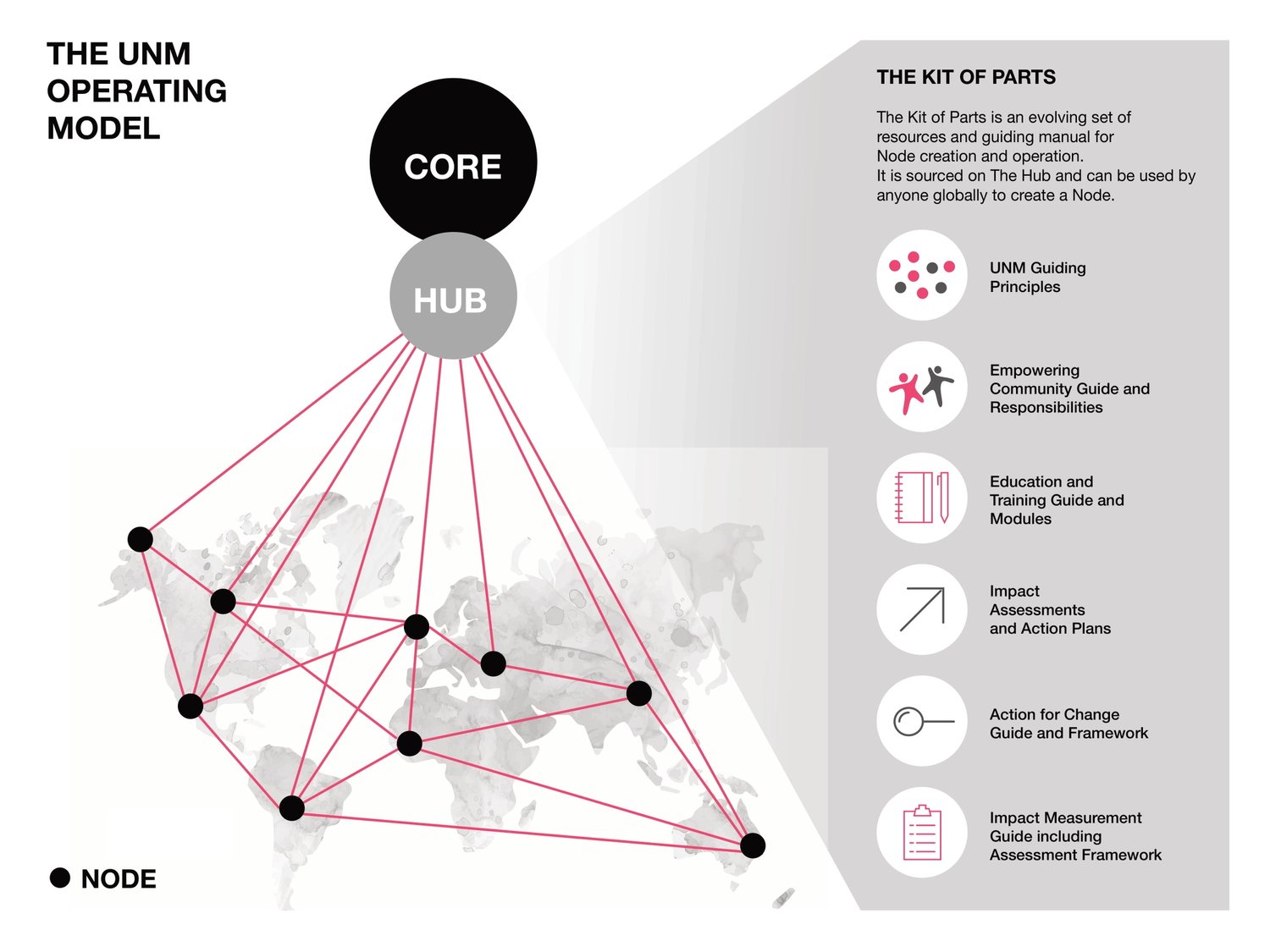The structure of the network links the museums as a series of interconnecting nodes to reduce rigidity and open barriers, both physical and metaphysical. The model subverts traditional practice through its governing structure and redesigned network, by functioning as a circular social enterprise (The Core) rather than a traditional, hierarchical authority. A suite of globally shared, ever-evolving resources are accessed via The Hub, a digital platform connecting communities and hosting a global conversation. The Hub details the framework for the network model (The What) and provides the Kit of Parts Toolkit (The How) to enable Node creation and operation.