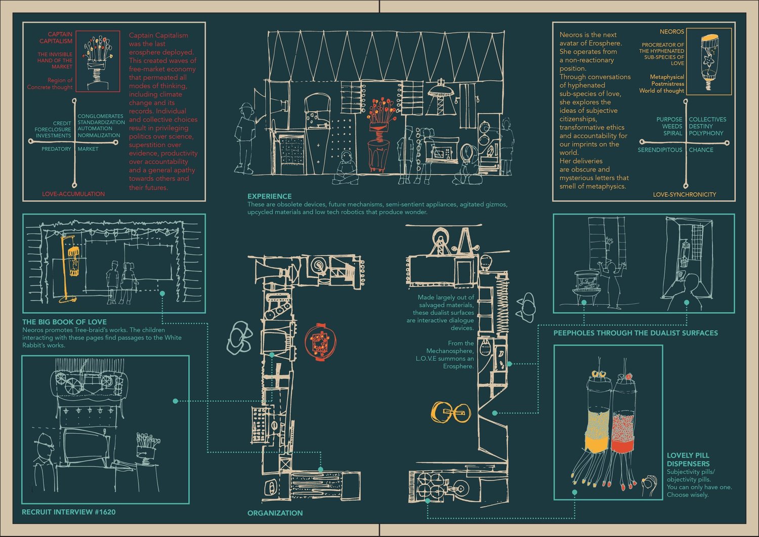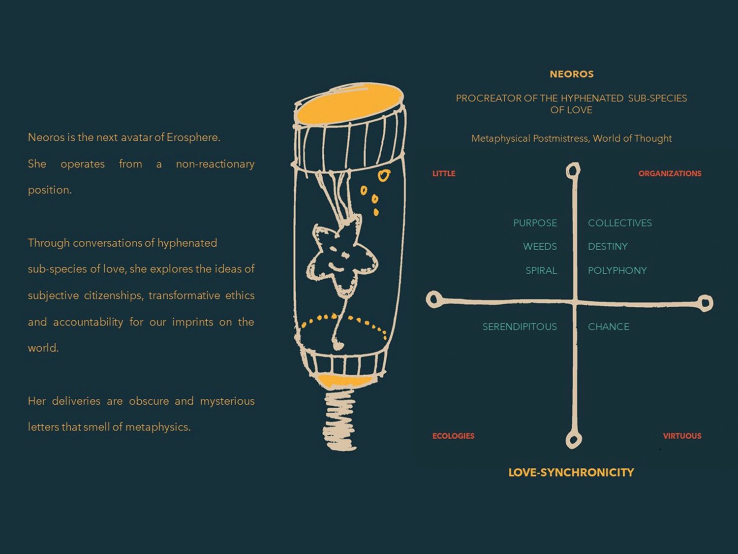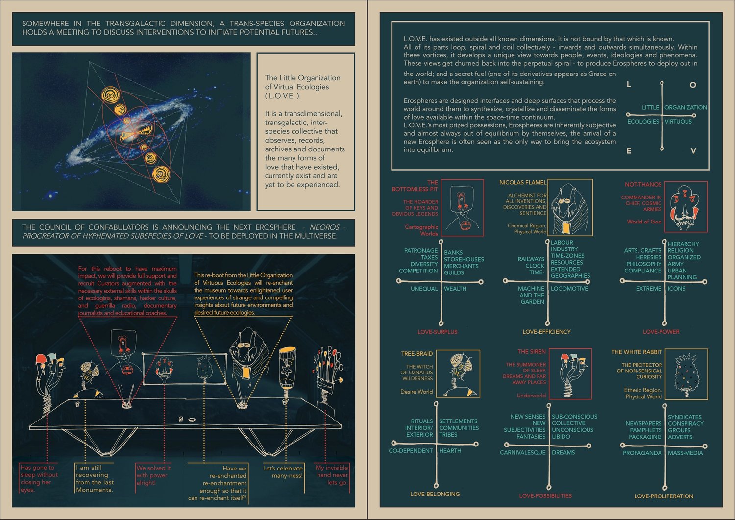 This project speculates that all forms of being in the world are guided by the forms of love that are available in an era. In order to transform the ways of engaging in the world, forms of love and forms of care that are available need to transform as well. It sets the search for answers within a speculative world where the available dimension of love is negotiated by a Little Organization of Virtuous Ecologies (L.O.V.E.) that deploys a range of scientific-poetic affects (called Erospheres) into the world.