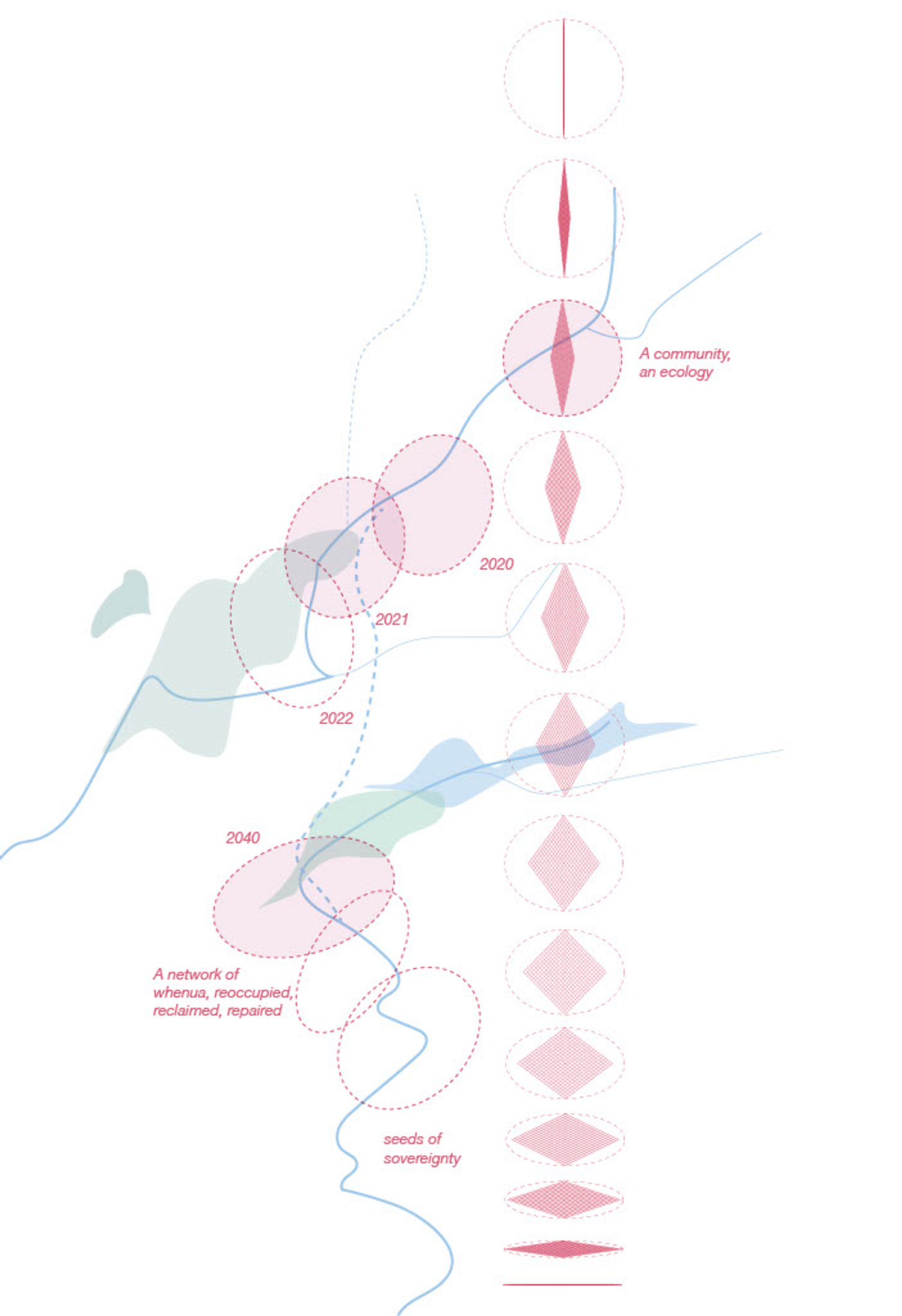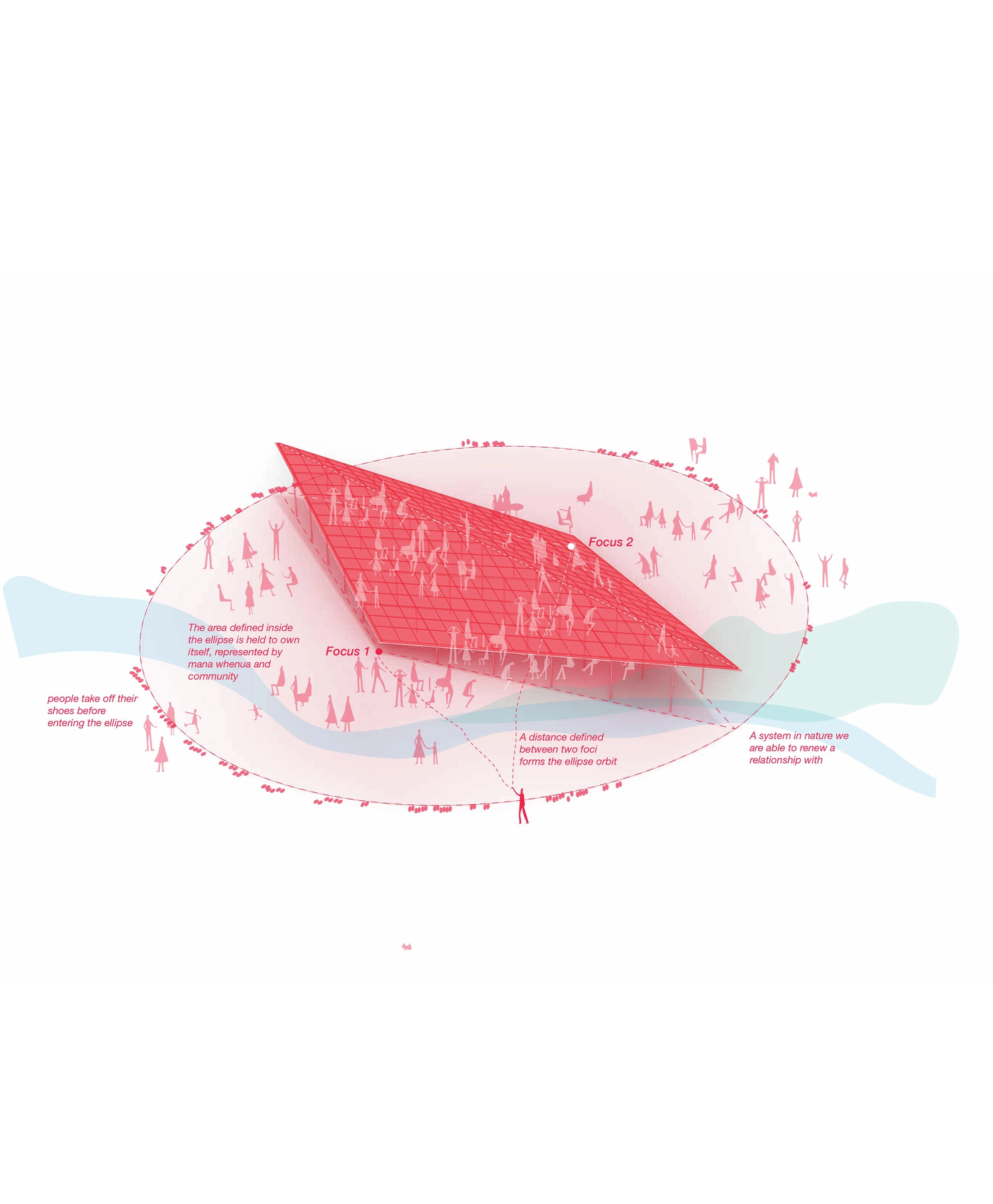 Our proposal is a space defined by mana whenua / Indigenous people with authority of a territory, together with local communities who locate in their environment two significant points tied together by a distance. Tracing an orbit creates an ellipse, a place in the landscape reclaimed as a centre of Indigenous sovereignty and a renewed relationship with these ecological and natural systems.