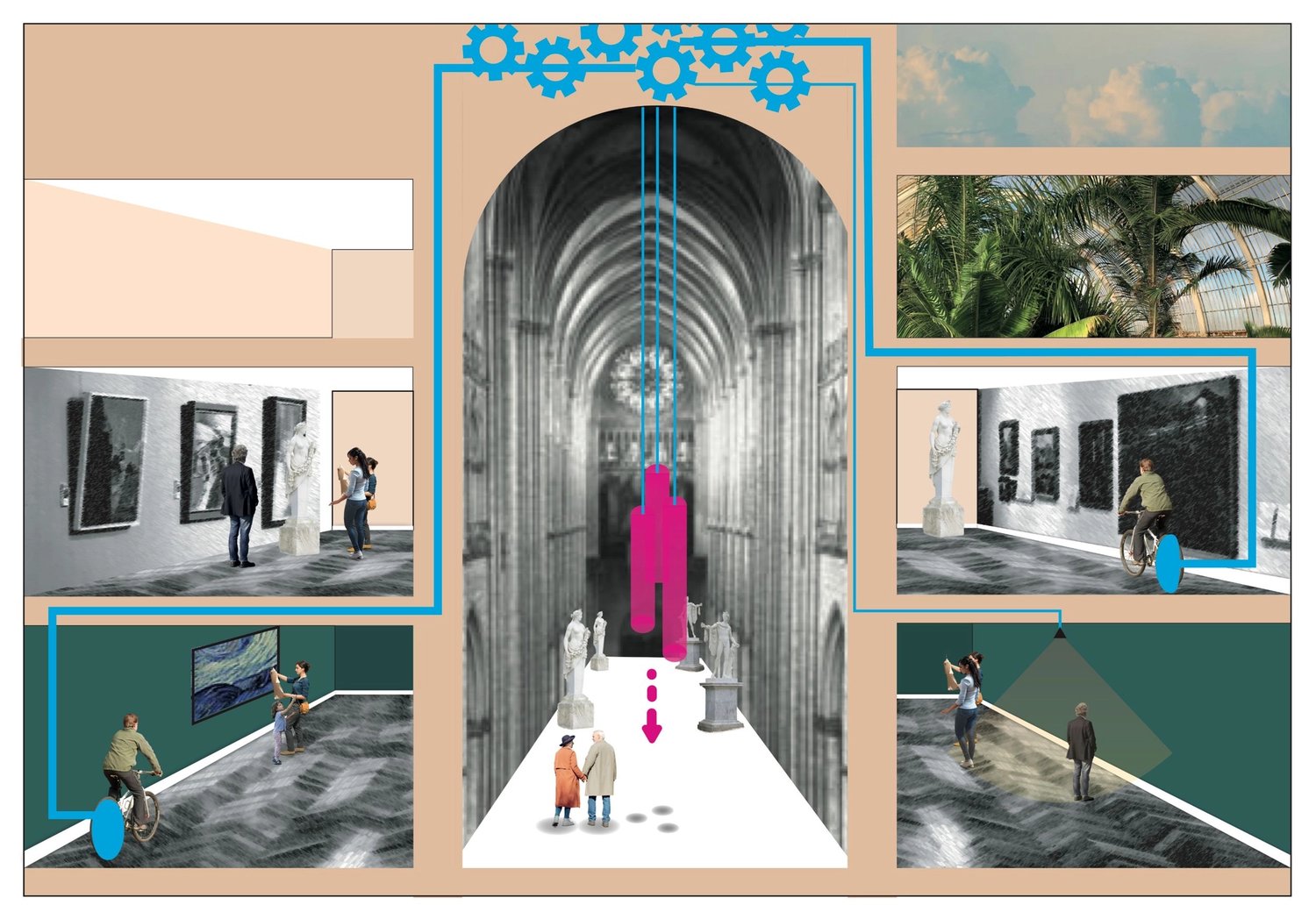 This concept is intended to be retrofitted into museums and can be scaled for individual exhibits, exhibitions, and to the entire museum. It can also be adapted for the different types of museums and could become an integral part of the visit, for example, the heavy weight could be an airplane, a sculpture, a garden. The idea of generating electricity while visiting a museum is interactive, encouraging families to visit museums, and broadening people’s understanding of the cost of energy supply.