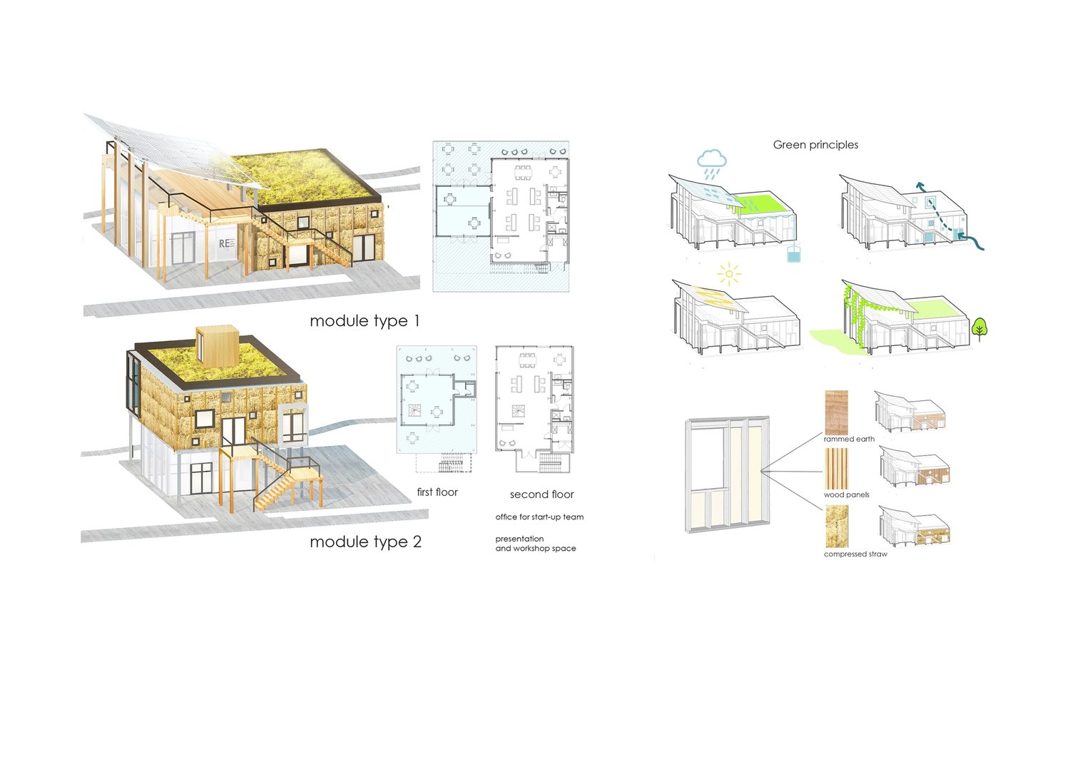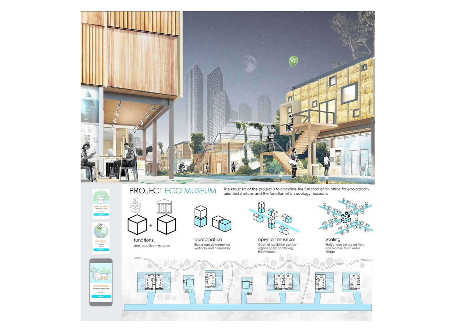 These functions are placed in modules; each module vertically or horizontally combines the space for exhibitions or workshops and office space. The project can be scaled and adapted to different situations. It can be an open-air museum, integrated into the urban environment or it may even be one module, which also serves as a leisure and educational centre - the project allows you to introduce the function of a museum locally and focus on educational activities, as well as ensuring the development and self-realization of the local community. This decision allows us to make knowledge about ecology more accessible, gives an opportunity for each person to contribute to the process of conserving the resources of our planet and reducing climate change. The modules themselves can serve as exhibits of the Museum of Ecology since they are created and operated according to the principles of green building.