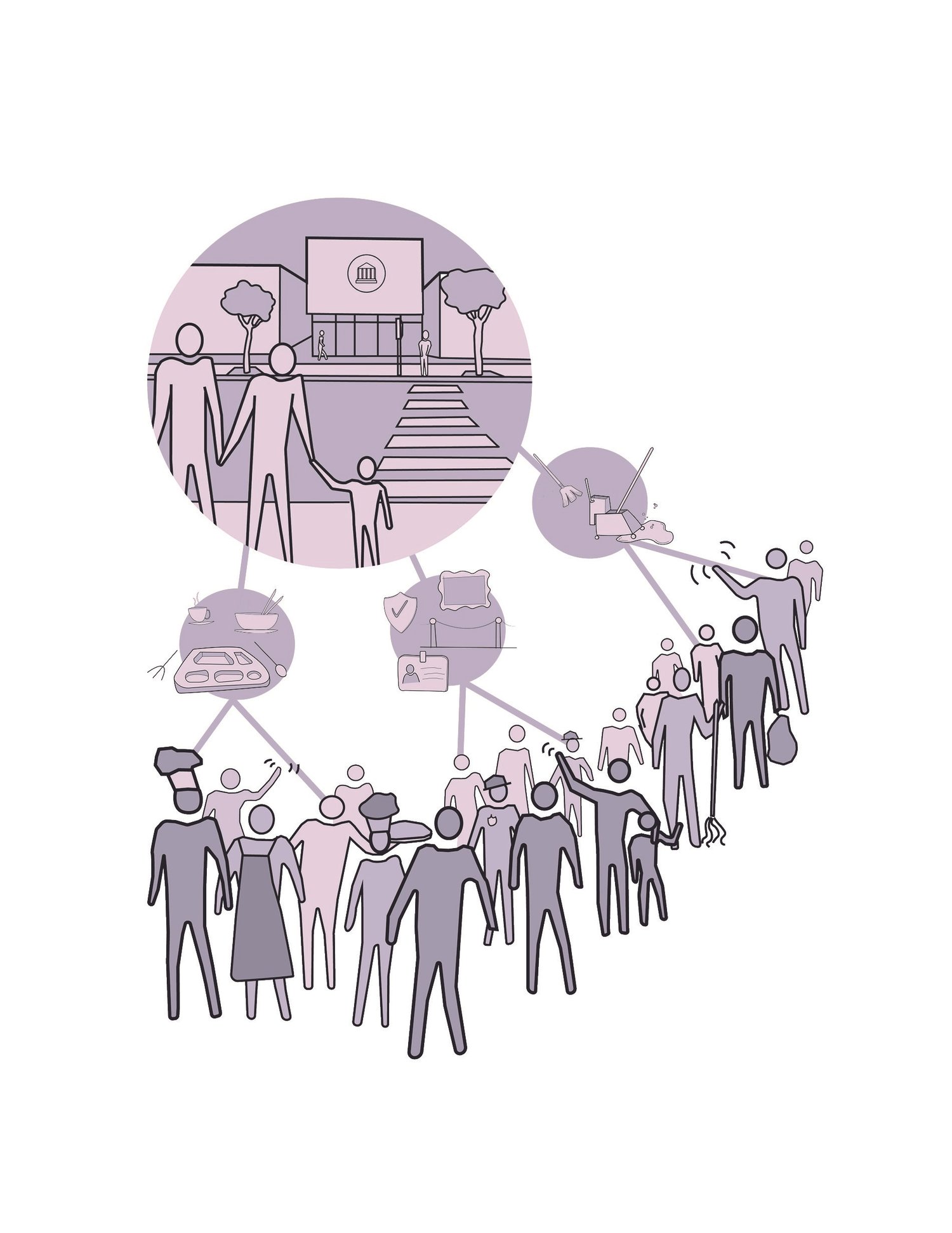 At the city scale, the museum can sew the seeds for an alternative cooperative economy. By divesting from multinational networks of resource extraction and investing in worker-owned coops for essential services like food, cleaning, security, and education, the museum can be at the forefront of a local, low-carbon economy. Reimagining these scales leads to their point of interaction—the museum lobby. Claiming this space for the betterment of the collective provides a site for storytelling or meeting for mutual aid.