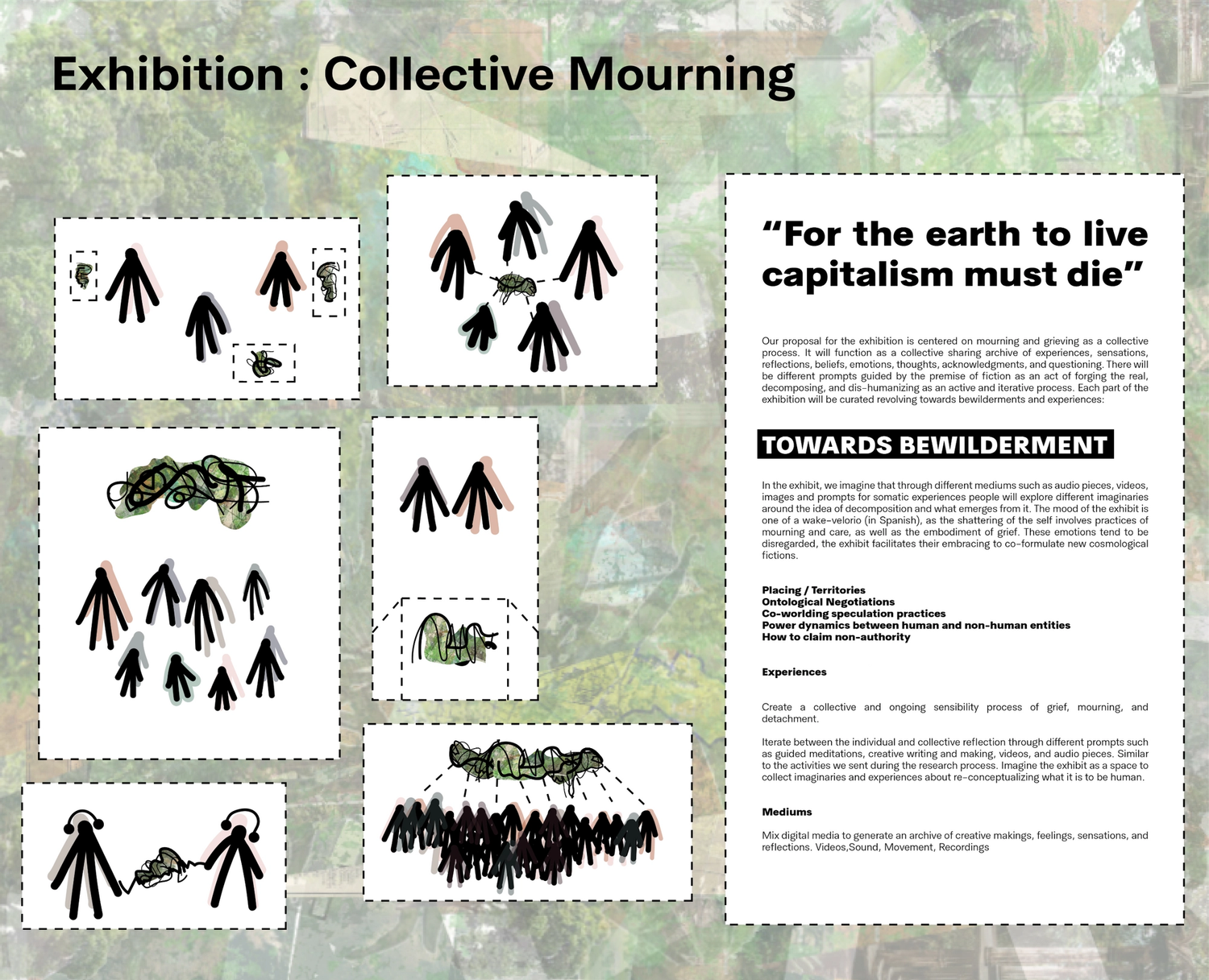 Museums are places of desire and imaginaries, thus we can transform them into places where we can build parliaments of new sensitivities, where human and non-human entities have political power breaking current political hierarchies. Firstly though, we need to address the traumas of collective and individual dehumanization. We propose to reimagine museums as temporary cemeteries of our human condition, where we can celebrate a wake that welcomes the uncertainty of an intentional shattering of the self.