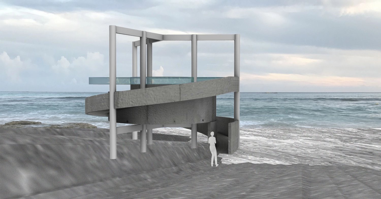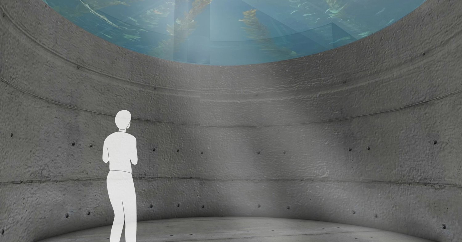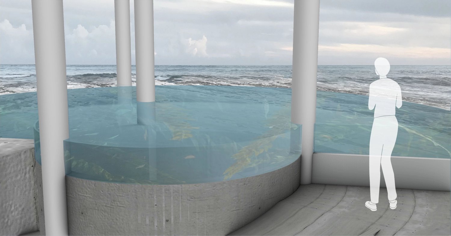 We envision the museum ‘between sea levels’, a living ecosystem that is changed by the interaction of the visitors. Situated in a subtropical shore, the museum is a replication of the ecosphere of the surrounding environment, raised up to the expected sea level that will engulf most human habitats due to global warming. The carbon footprint of the visitors will be translated into a corresponding increase in the acidity of the aquarium, as a miniature model of our future ocean environment.