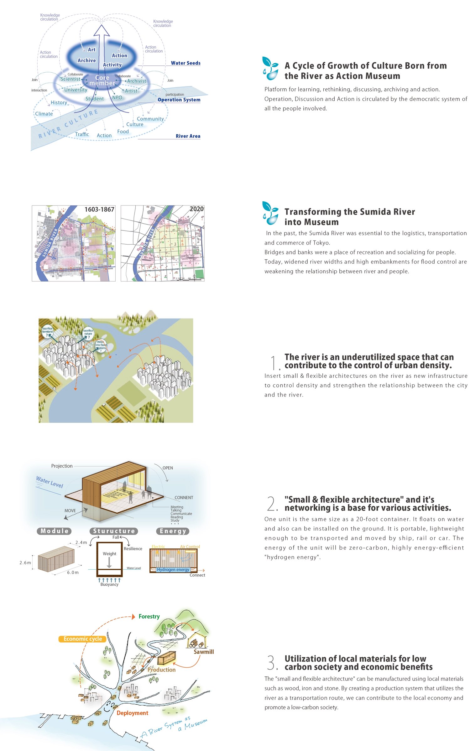 The river is an underutilized public space in the city, a mother of local culture and a barometer of climate change. We see the urban river as a museum. A group of small-sized floating architectures will be moored on the water to be used as a stage for exhibitions, performances and dialogues. These programs would be run democratically with public participation. In this way, we hope to promote citizens' understanding and imagination about the history and future of the river and the city, and to provoke positive climate action.