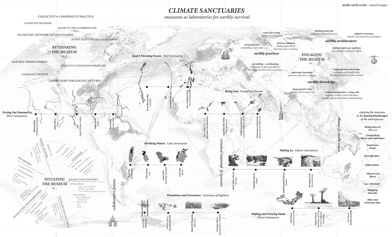 Our house is burning. We have lost ground. This project represents the search for new ways of situating museums in the intertwined planetary meshwork of the Anthropocene. The static character of the classical museum needs to be radically rethought. Museums for Climate Action will serve as testing sites; a planetary network of climate sanctuaries for the search for future lifeforms and co-existences. These sanctuaries actively engage in the haunted climate landscapes of our times, revealing the vast effects of planetary urbanization by being situated in the remote, yet heavily influenced edges and hinterlands of our planet. From vanishing glaciers to drying rivers, they will serve as curators and agents of processes and earthly collections. From coral temples to ice towers, the sanctuaries are understood as planetary laboratories, where forgotten practices and knowledge are revealed, tested and transformed into new narratives on how to live, coexist and re-act.