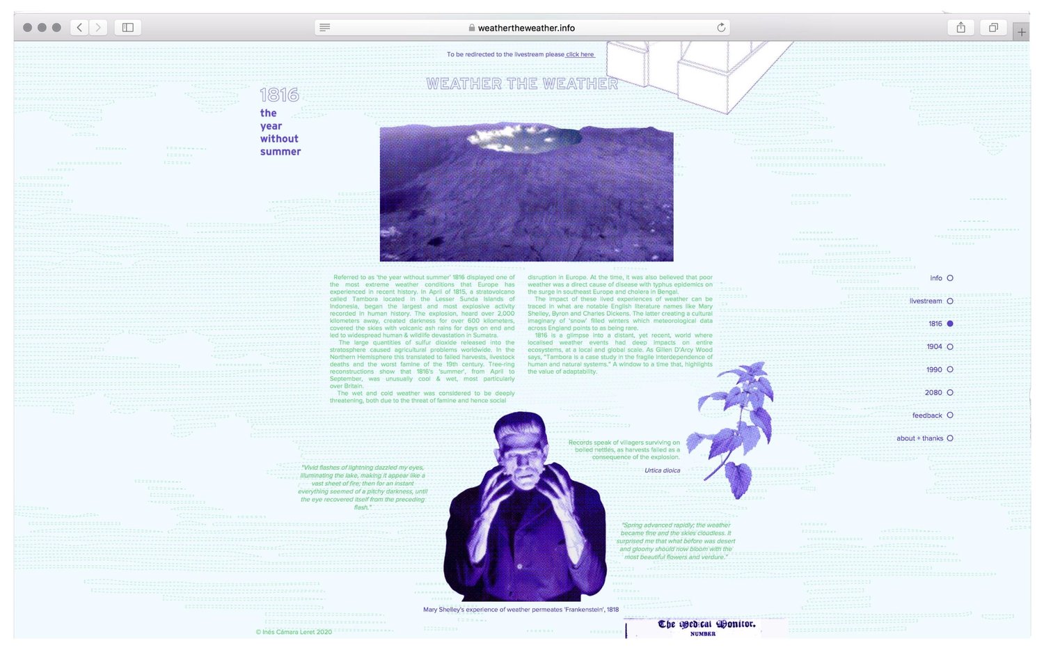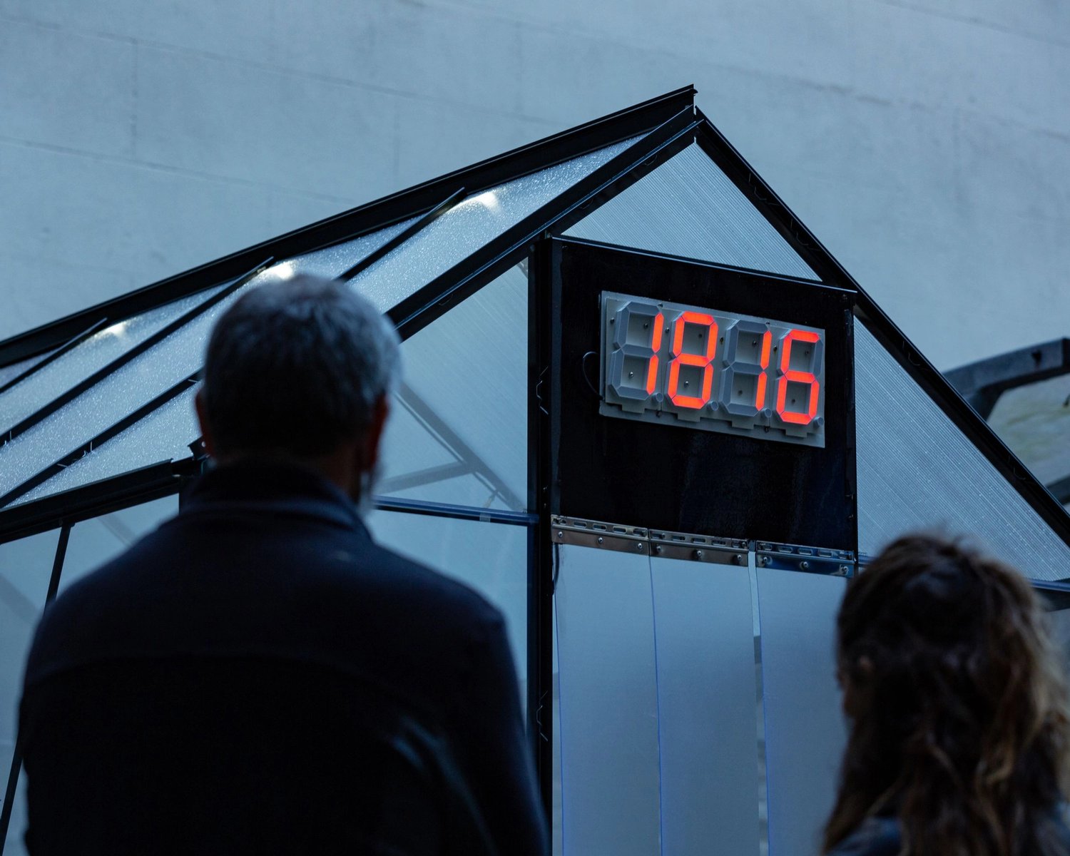 Weather the Weather recreates weather conditions of the same date, but of past and future years. The installation highlights what today's weather was like back in the 1800s or what tomorrow's weather may feel like in 2080, when today's children are adults. The work seeks to address one of the main obstacles to engage with climate change: that of psychological distancing.